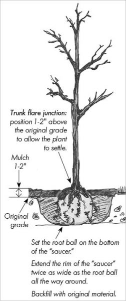 • Dig a hole twice as wide as the root ball and deep enough to leave the trunk flare exposed at the same level that it originally came out of the ground. Plant 1-2" above grade to allow the plant to settle. Backfill with original material.